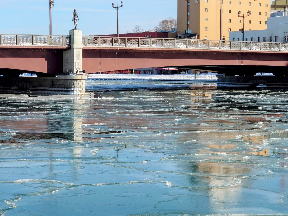寒さが厳しいこの季節にしか見られない釧路川の蓮葉氷(はすはごおり)。