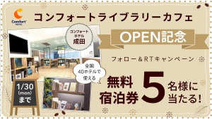 ※キャンペーンは終了しました。 2月1日、コンフォートホテル成田に「Comfort Library Cafe」がOPEN! ⇒ Comfort Library Cafe 詳しくはこちら それを記念して、コンフォートホテルの公式Twitterをフォロー&リツイートすると コンフォートライブラ...
