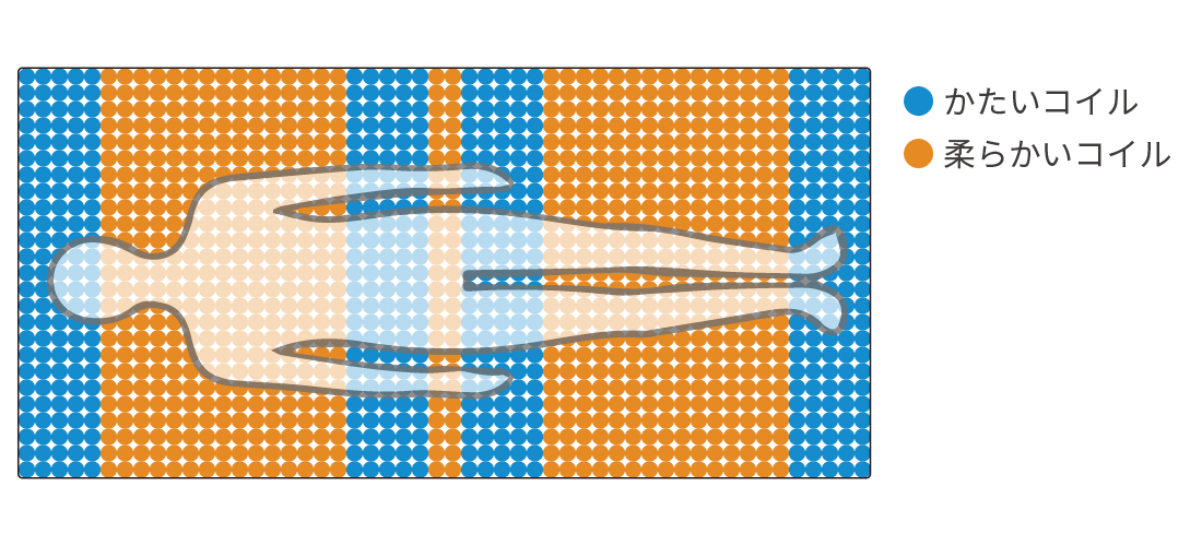 「チョイスオリジナル7ZONEマットレス」の最大の特長は、ポケットコイルが7つのゾーンに分かれていることです。腰や太ももにはかためのコイルがあたるように配置し、しっかりと支えます。一方、肩や背中にはやわらかいコイルを配置し、優しくサポートします。これにより、理想の寝姿勢といわれる「立位」が実現されます。