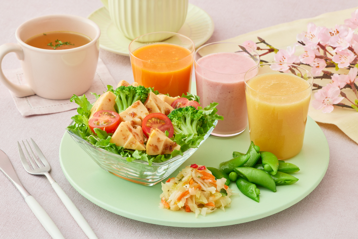 2025年3月1日(土)~2025年5月31日(土)まで提供する春限定メニューには、旬のいちごやグレープフルーツ、にんじんなどを使った春らしさ満開の3種のスムージーや、竹の子やキャベツ、菜の花などの春定番の野菜を存分に楽しめるサラダが4種日替わりで登場します。