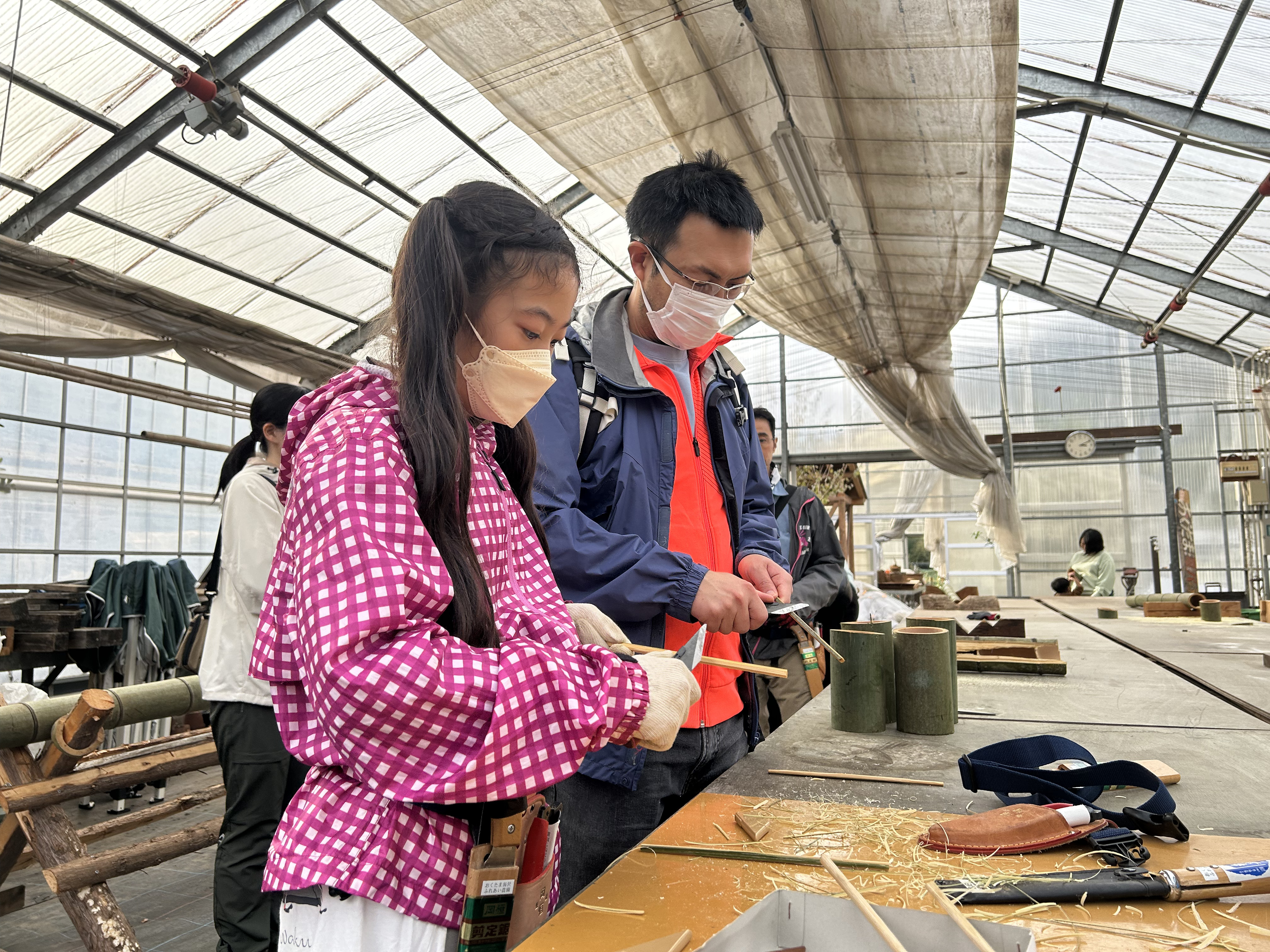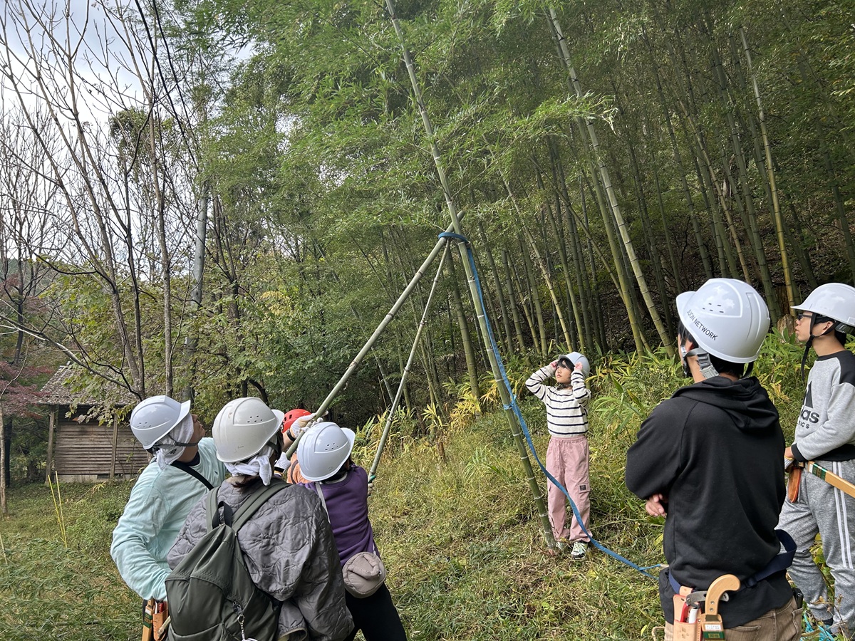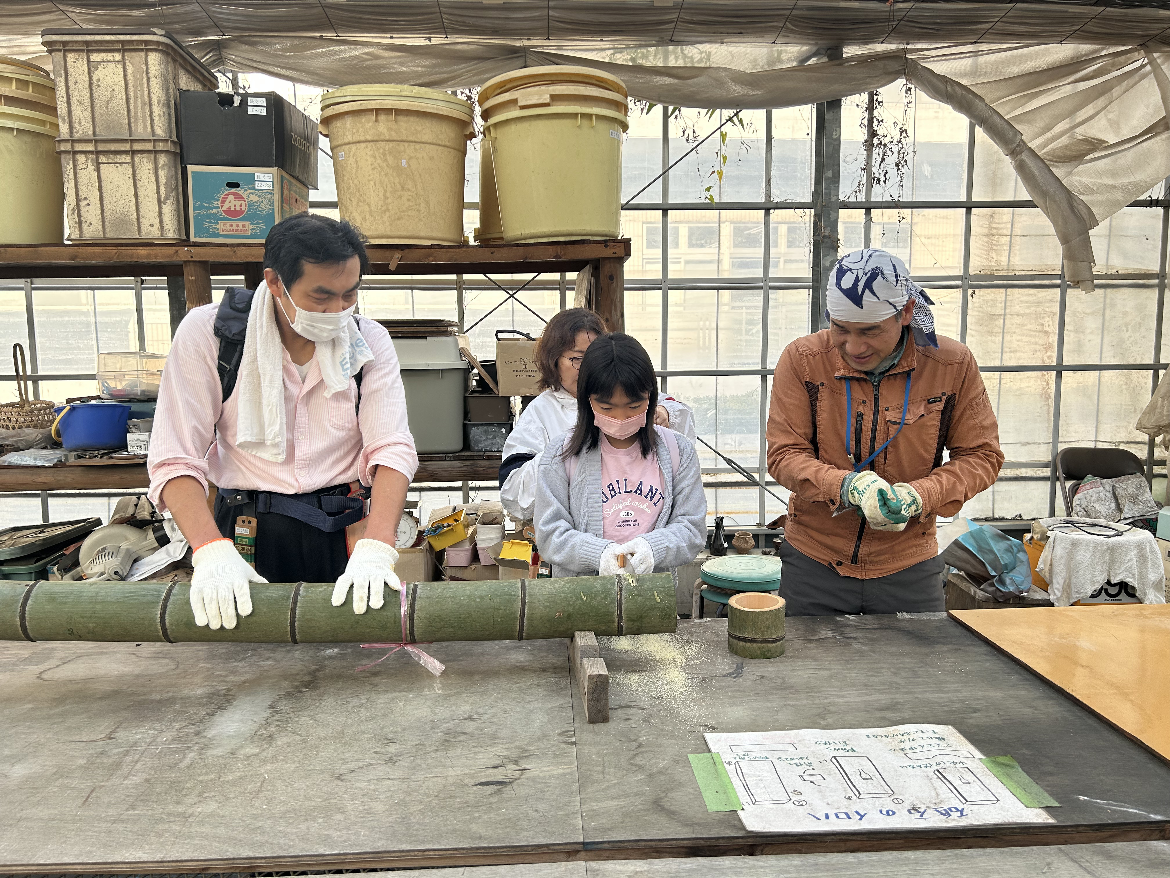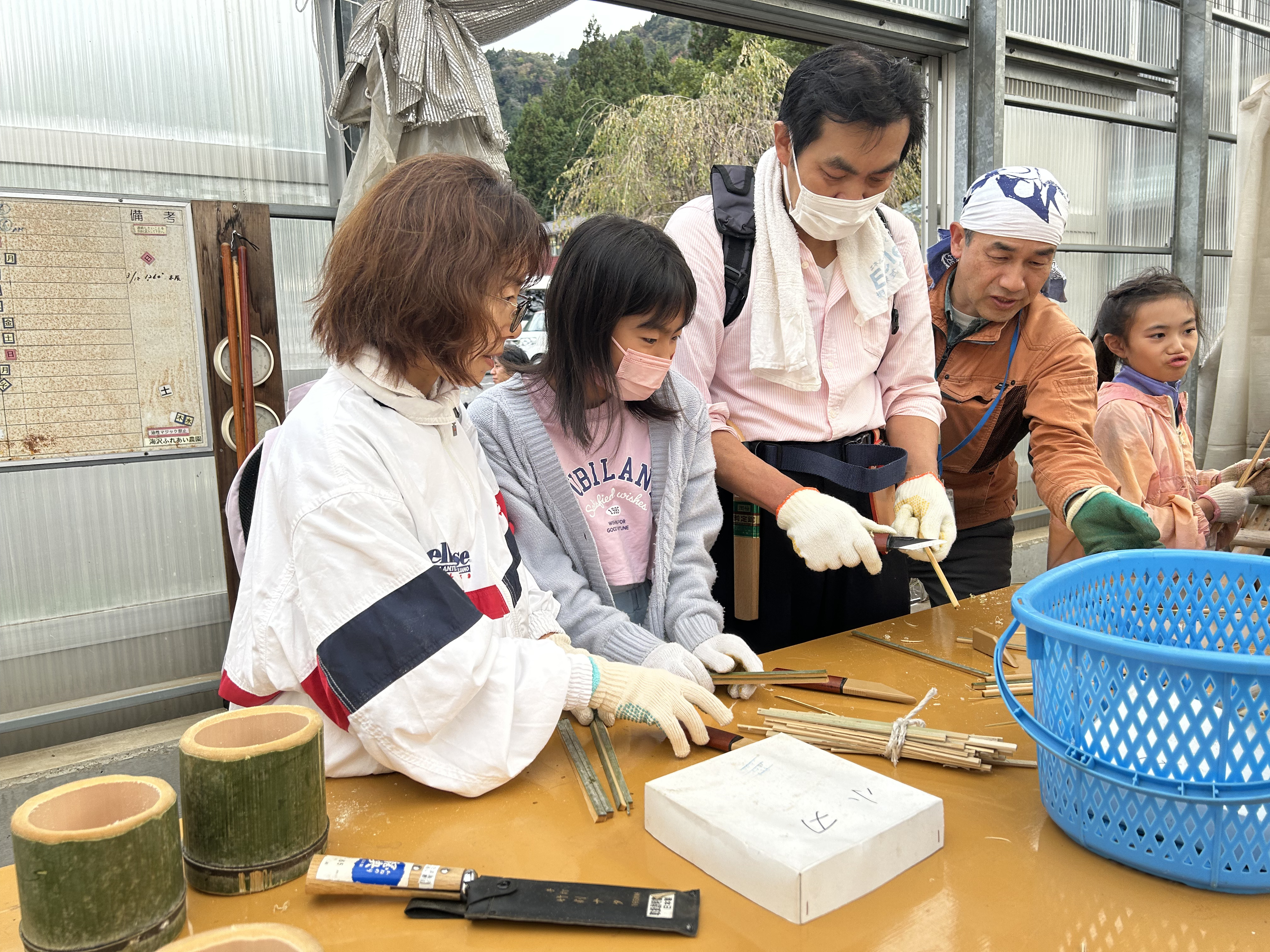 約1時間の伐採体験の後は、自分たちで伐採した竹を使った竹細工のワークショップに挑戦!