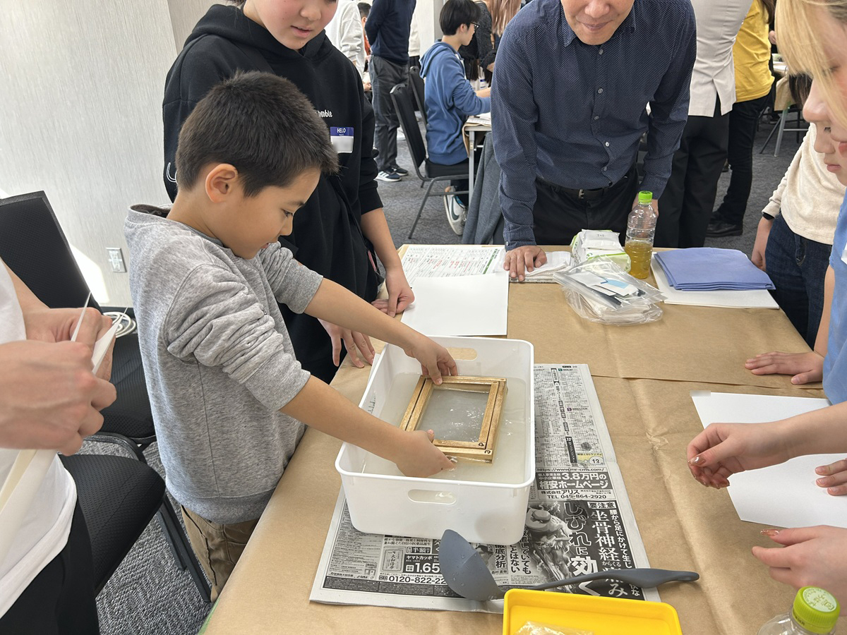 武蔵野大学工学部サステナビリティ学科の学生から分かりやすい説明を受けながら、子どもたちは実際に紙漉きに挑戦しました。