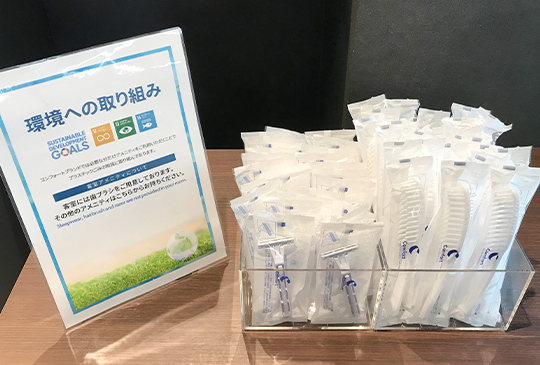 2022年4月1日より施行の「プラスチック資源循環促進法」に合わせ、2022年4月1日から客室にはハブラシのみをご用意し、ヘアブラシ・カミソリはロビーのアメニティコーナーに設置しています。